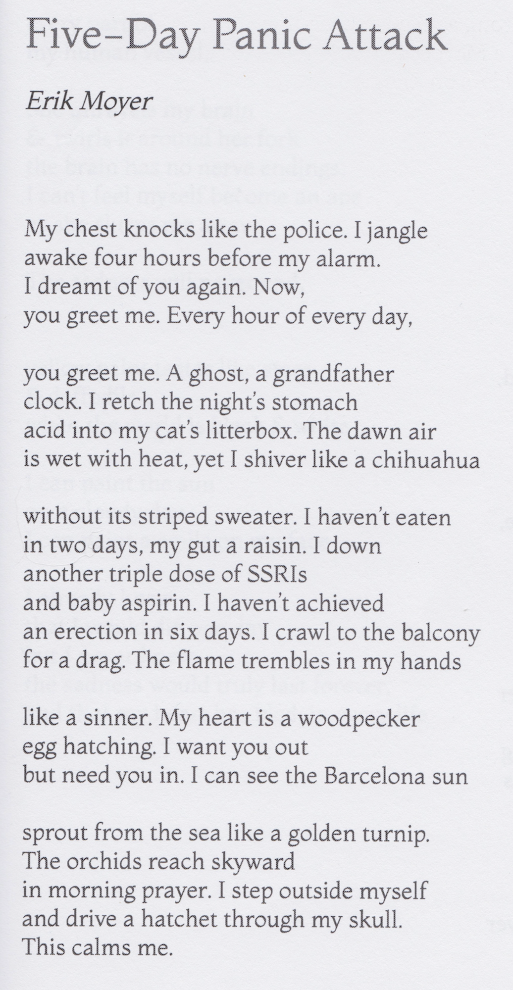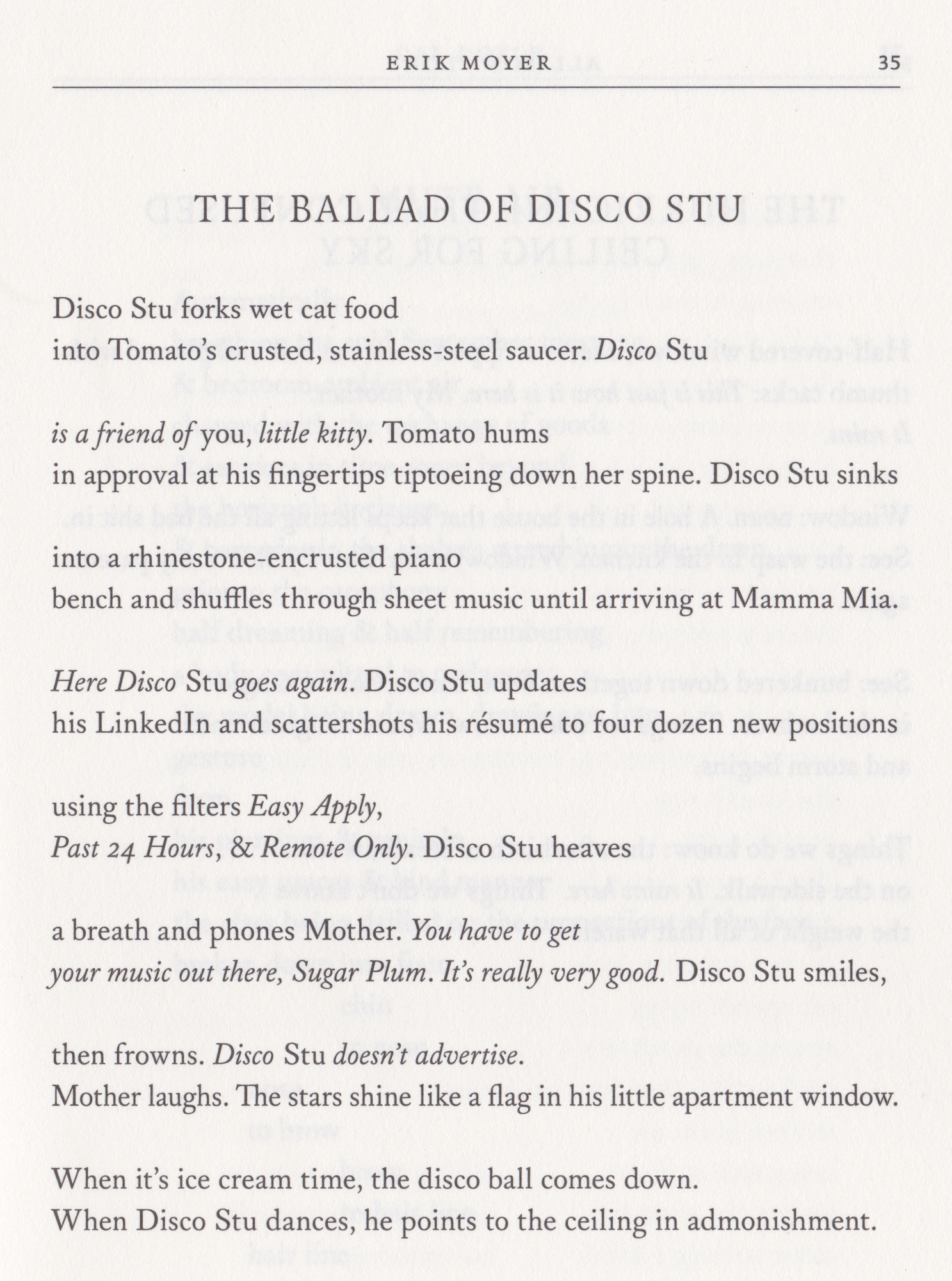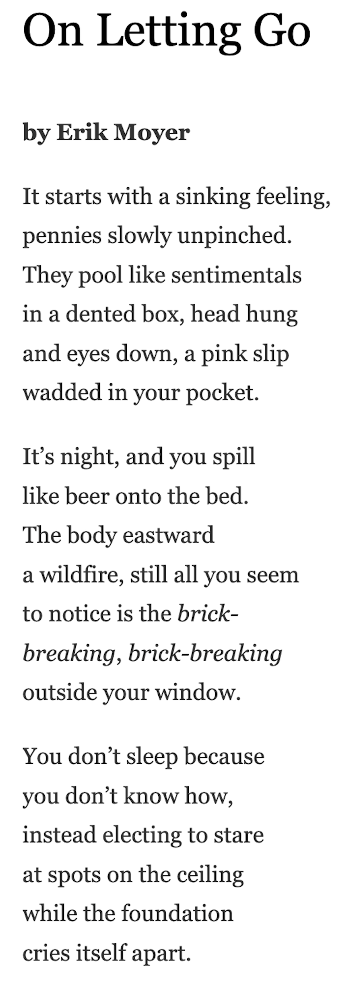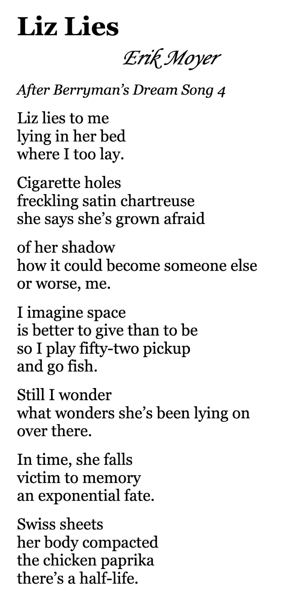 Erik Moyer is a writer and data engineer. He holds a PhD in creative writing from the University of North Texas, an MFA in writing from the University of California, Irvine, and a BS in systems engineering and poetry writing from the University of Virginia. His work appears in Arts & Letters, Columbia Journal, The New York Times, Oxford Poetry, The Pinch, and elsewhere. In past lives, he's worked as a university writing instructor and an emergency medical technician, and has done time in New Jersey, Virginia, Washington DC, San Diego, and Los Angeles. In his free time, he enjoys writing songs, playing chess, and convincing his cat, Xena, that shoelaces are, in fact, snakes. He lives in Denton, Texas.
