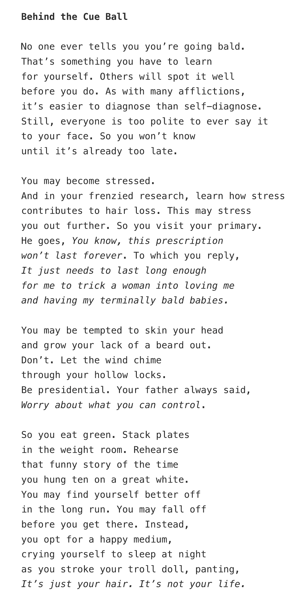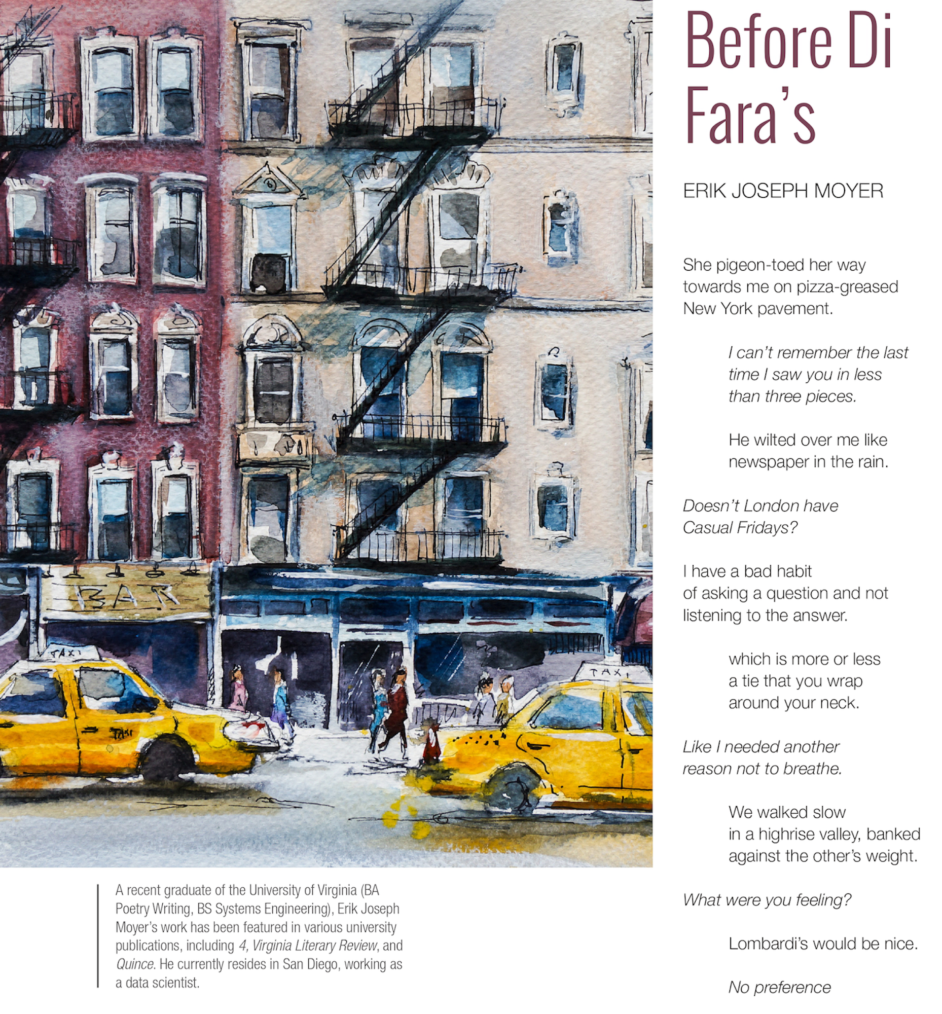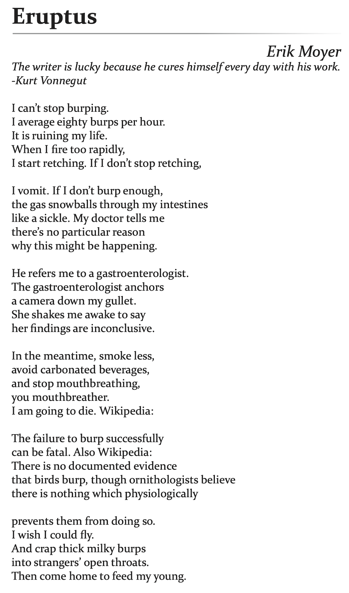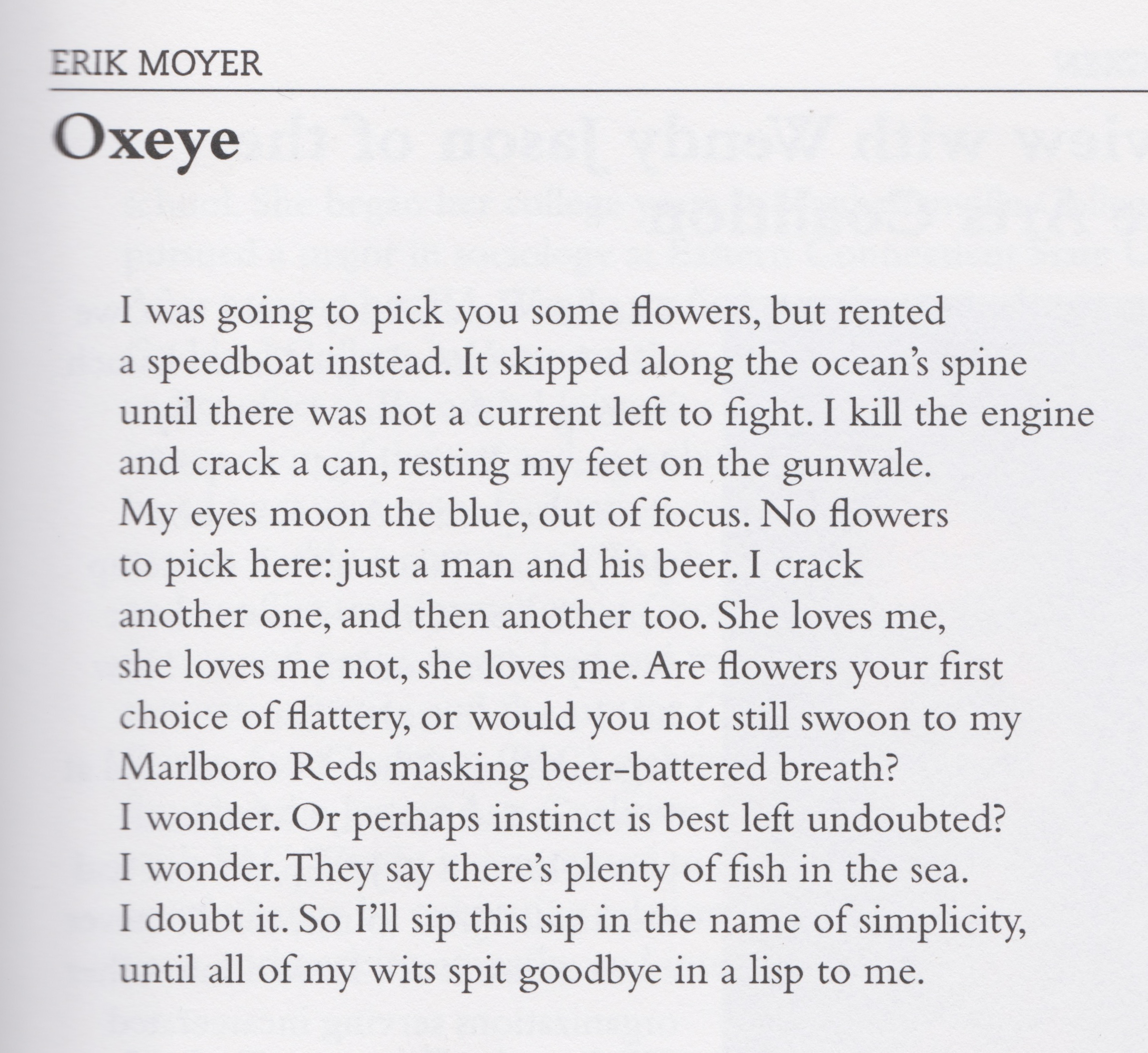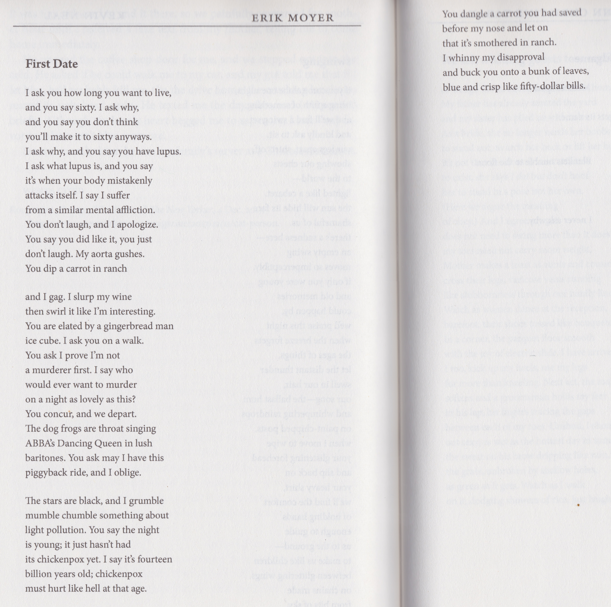Erik Moyer is a writer and data engineer. He holds a PhD in creative writing from the University of North Texas, an MFA in writing from the University of California, Irvine, and a BS in systems engineering and poetry writing from the University of Virginia. His work appears in Arts & Letters, Columbia Journal, The New York Times, Oxford Poetry, The Pinch, and elsewhere. In past lives, he's worked as a university writing instructor and an emergency medical technician, and has done time in New Jersey, Virginia, Washington DC, San Diego, and Los Angeles. In his free time, he enjoys writing songs, playing chess, and convincing his cat, Xena, that shoelaces are, in fact, snakes. He lives in Denton, Texas.