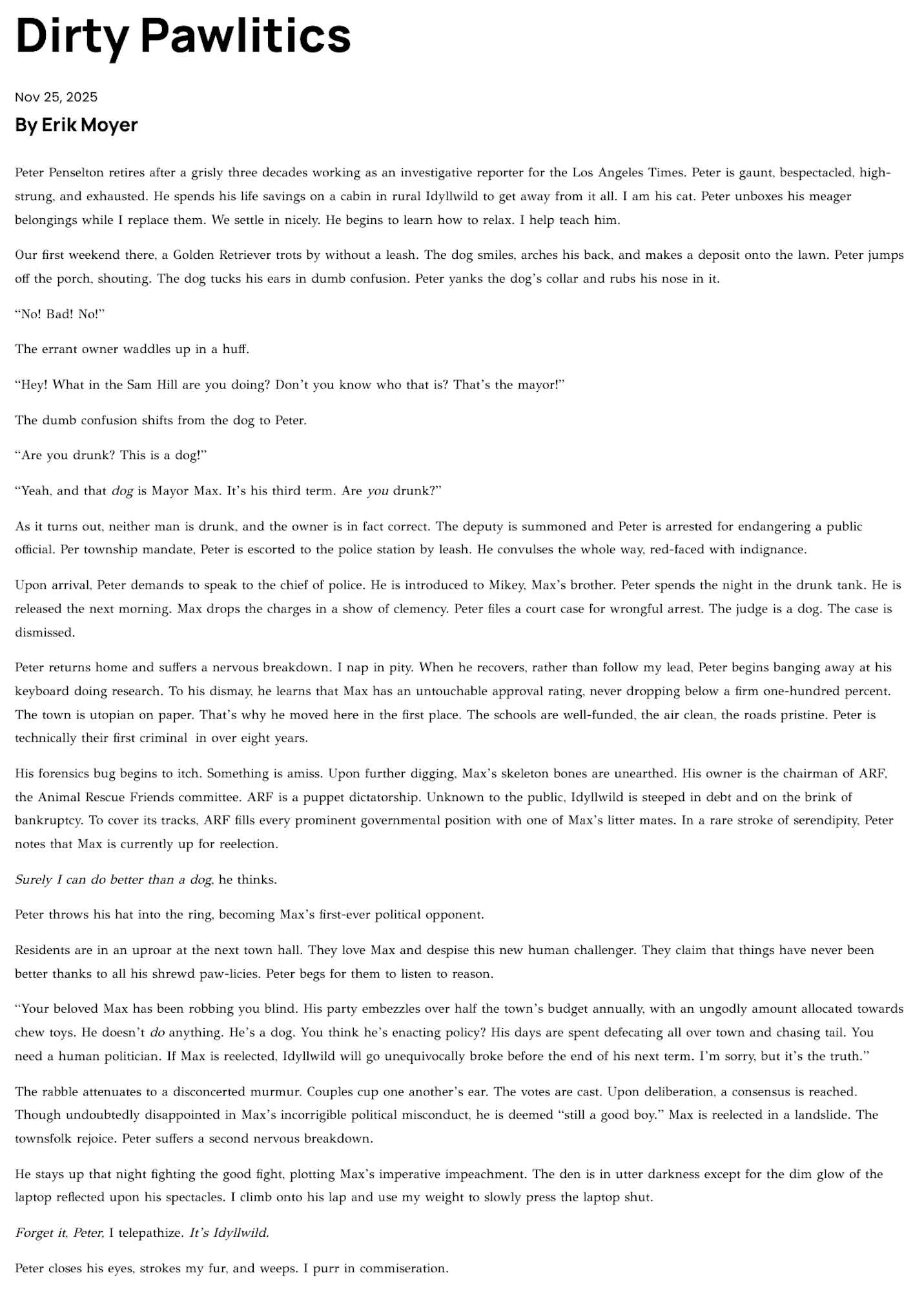 "Dirty Pawlitics," Columbia Journal, Columbia University, Flash Fiction, Online, November 2025