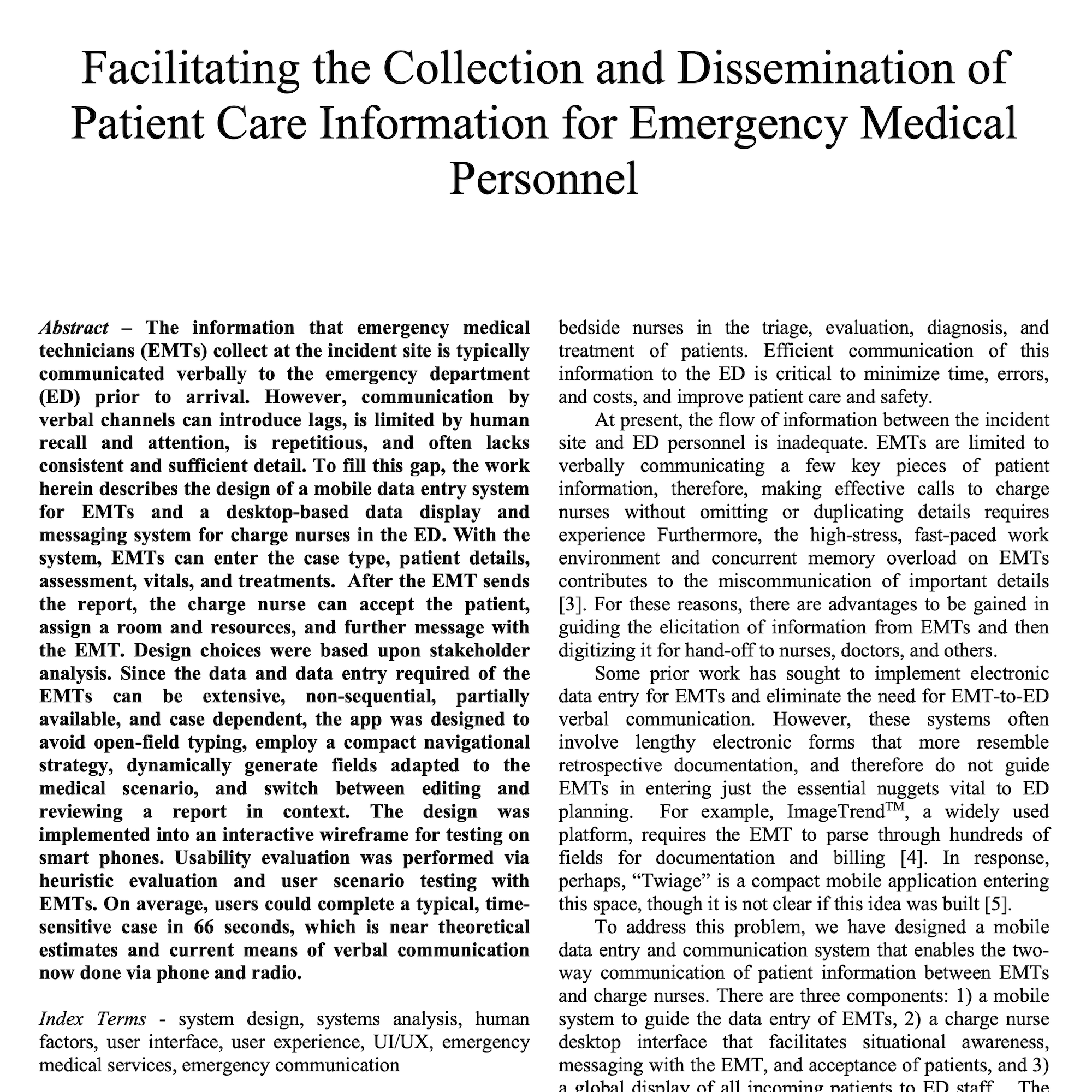 "Facilitating the Collection and Dissemination of Patient Care Information for Emergency Medical Personnel,” SIEDS 2016, IEEE, University of Virginia, Undergraduate Engineering Capstone Project, Design-Prototype Conference Paper, Online, April 2016