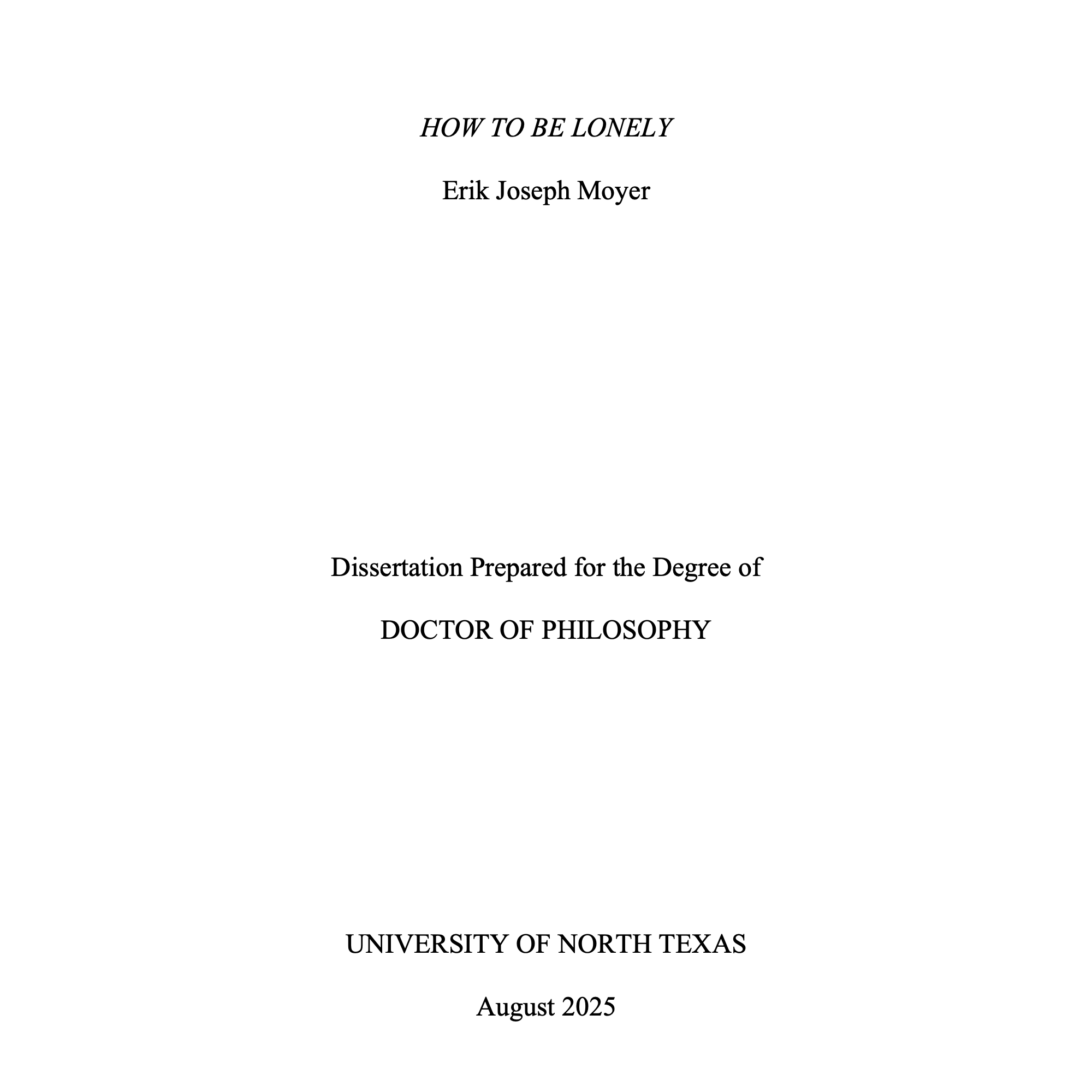 How to Be Lonely, UNT Digital Library, University of North Texas, Creative Doctoral Dissertation, Critical Preface & Poetry Collection, Online, Under Embargo, August 2025
