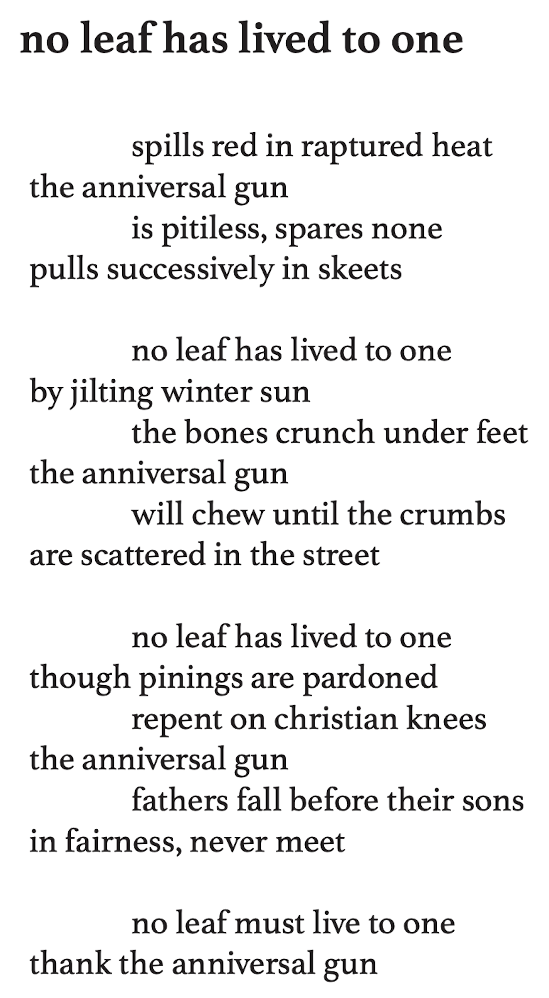 "No Leaf Has Lived to One," Berkeley Poetry Review, University of California, Berkeley, Online & Print, February 2024