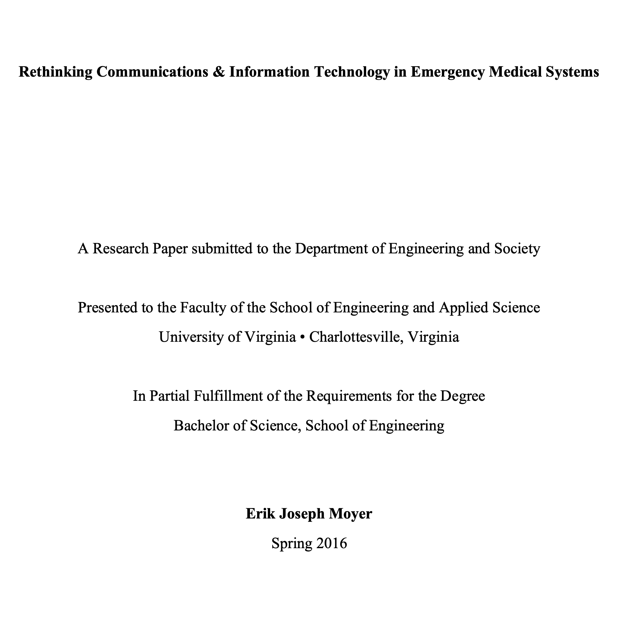 Rethinking Communications and Information Technology in Emergency Medicine, UVA Library, University of Virginia, Undergraduate Thesis, Research Paper, Online, By Request, May 2016