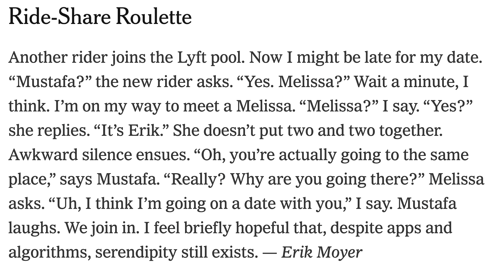 "Ride-Share Roulette," The New York Times, Modern Love Column, Tiny Love Stories Feature, Micro Personal Narrative, Online & Print, March 2025