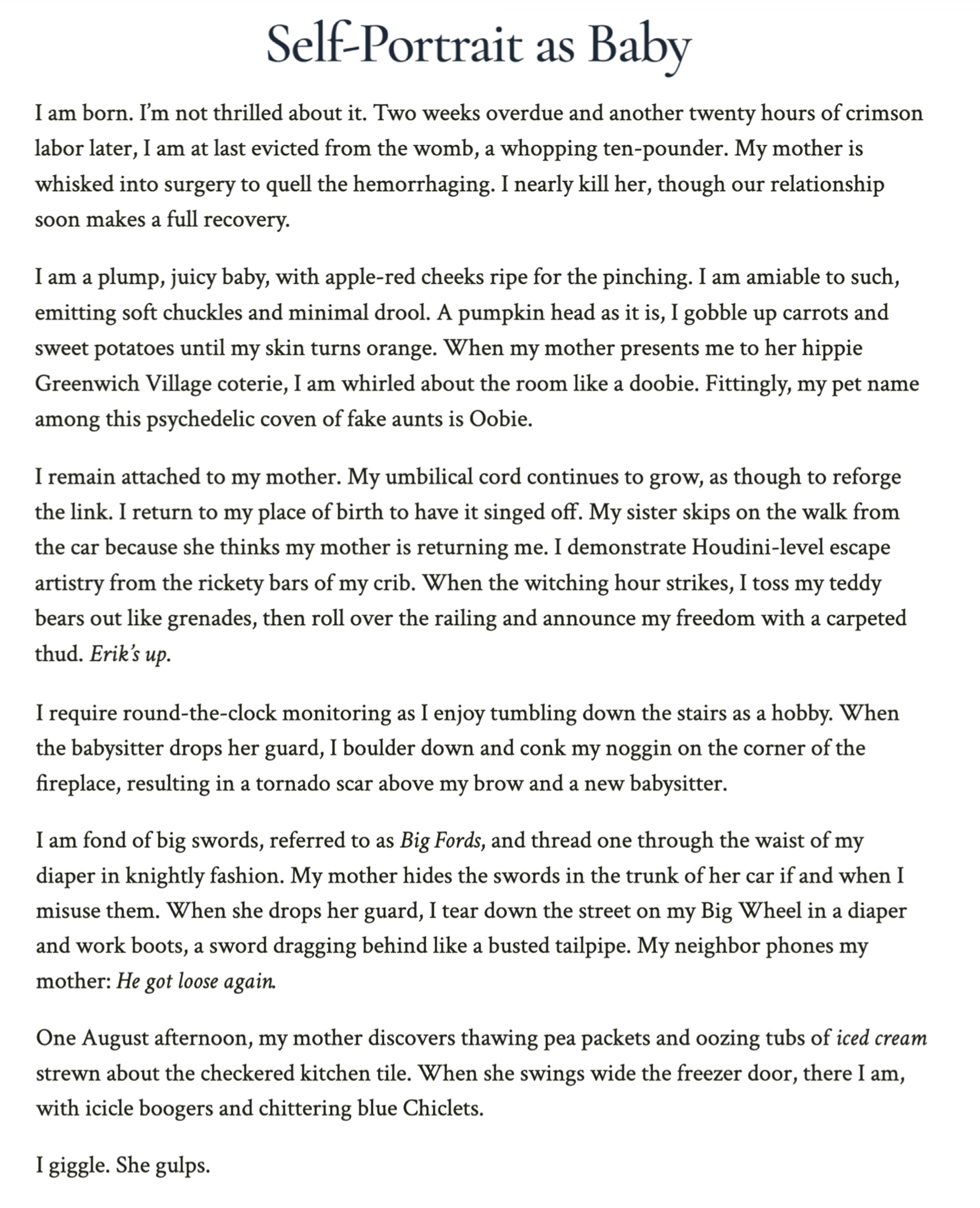 "Self-Portrait as Baby," Phoebe Journal, George Mason University, Flash Personal Narrative, Online, May 2025