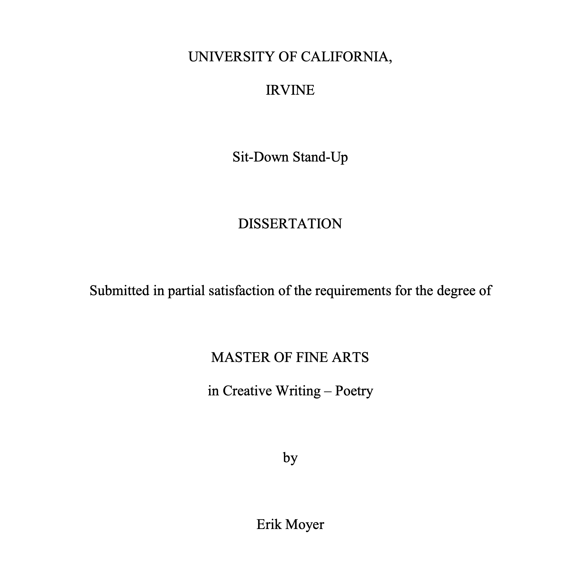 Sit-Down Stand-Up, ProQuest, University of California, Irvine, Master's Thesis, Poetry Collection, Online, Under Embargo, September 2021