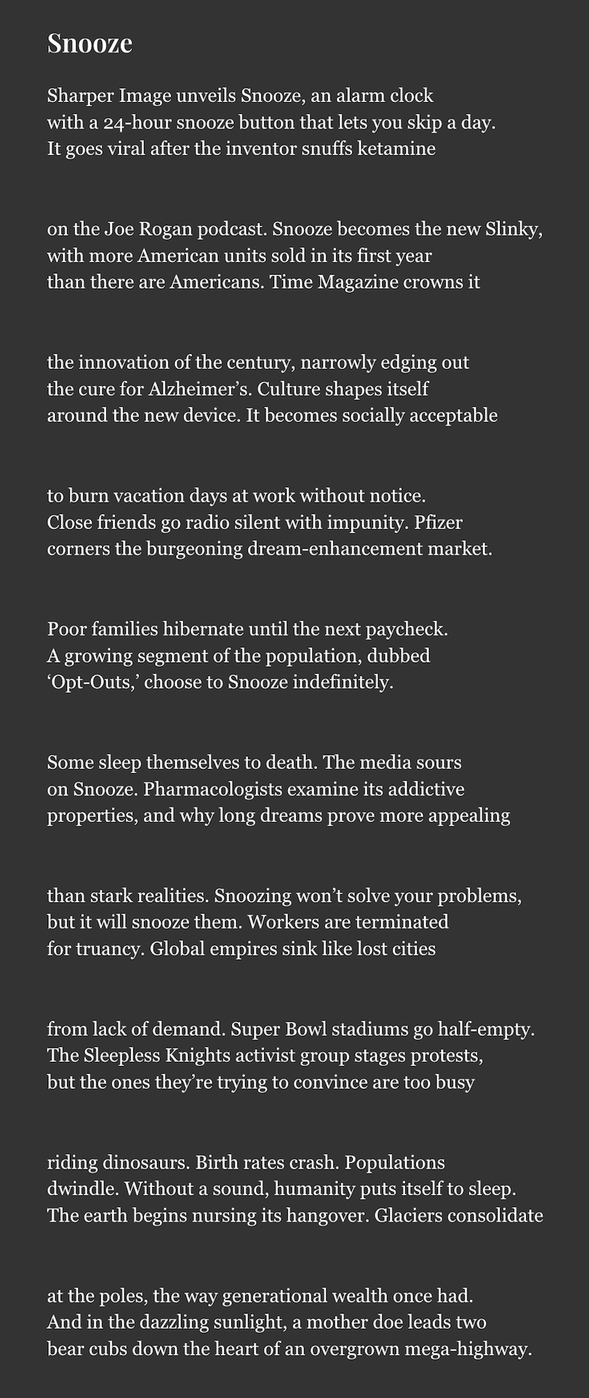 "Snooze," Apricity Magazine, University of Texas at Austin, Online, January 2022