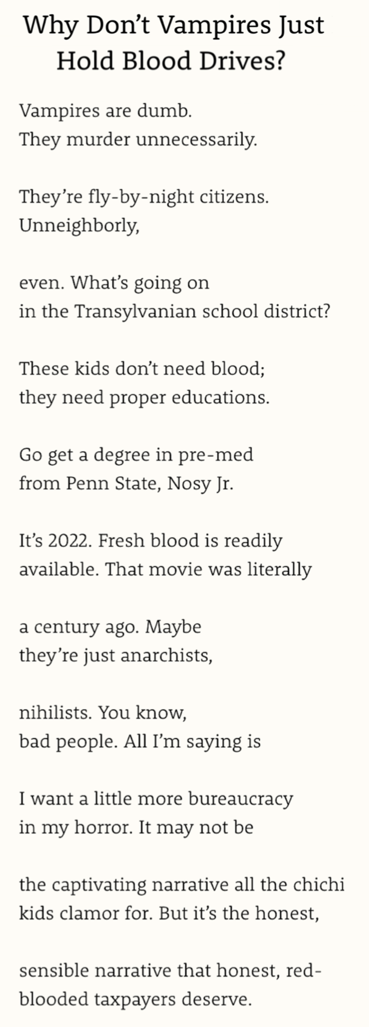 "Why Don't Vampires Just Hold Blood Drives?," Cola Literary Review, University of South Carolina, Online, April 2023